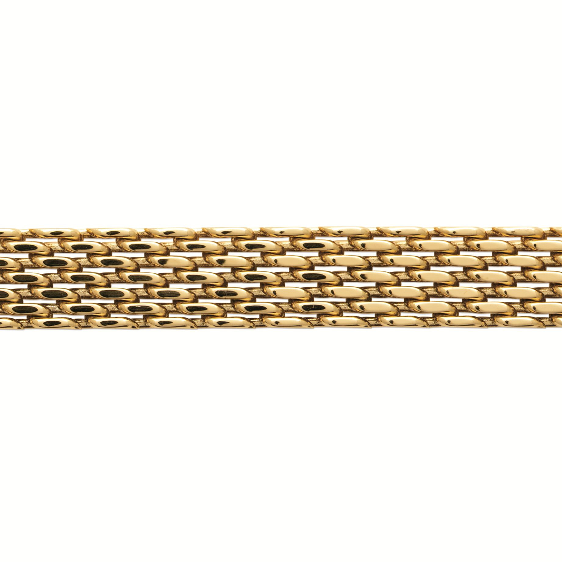 Son design sophistiqué, composé de maillons imbriqués avec précision, crée un ruban d'or articulé qui épouse parfaitement le poignet.